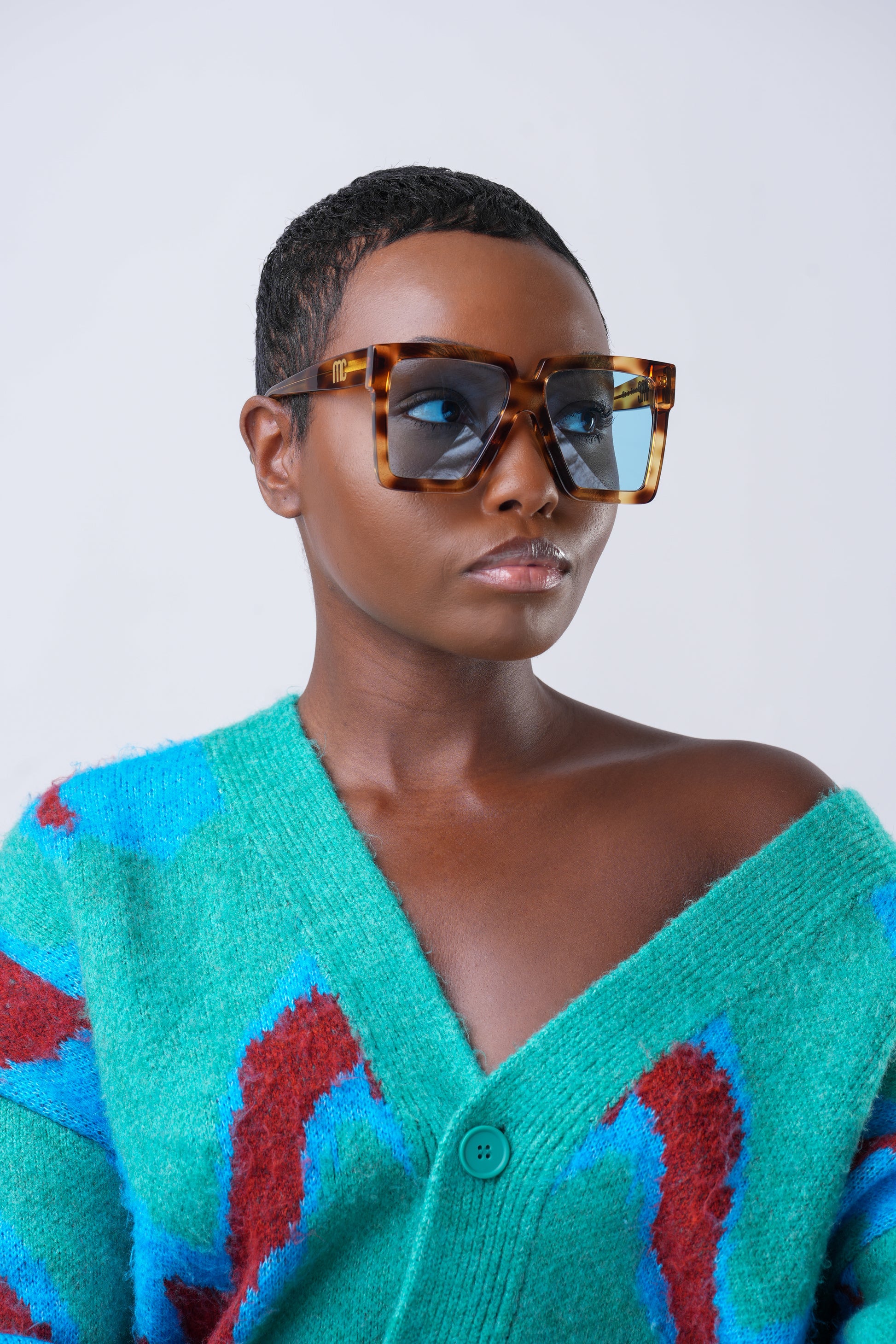 Meet Nova, a standout oversized frame made to be seen. Featuring a tortoiseshell frame and vibrant blue-tinted lenses with gold hardware, you're sure to command attention.